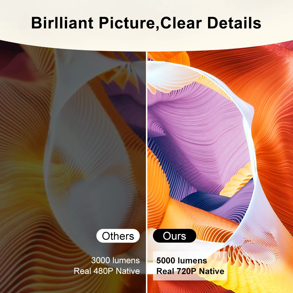 This HD Projector , the wifi projector adopted upgraded technology with super bright LEDs and LCD display, 100%+Brightness and 5000:1 high contrast ensure wider color gamut and clearest images for indoor and outdoor movie watching.