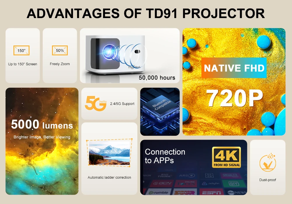 TD91W Android Version 6D Innovative Keystone Correction and With 100-50% Zoom function